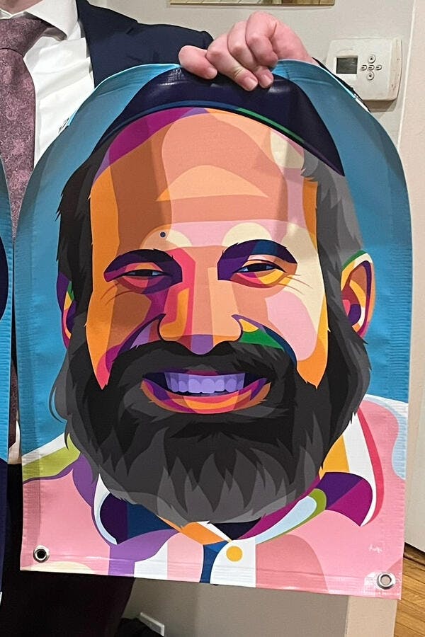 Anshie Kagan’s ironic and often dark artwork covers a variety of motifs and themes and is influenced by the Pop Art movement of the 1950’s incorporating current cultural, technological and social themes. The juxtaposition of iconic ultra-Orthodox rabbinic leaders depicted on bright or psychedelic patterned backgrounds toys with the usual portrayal of a monotonal religious culture.